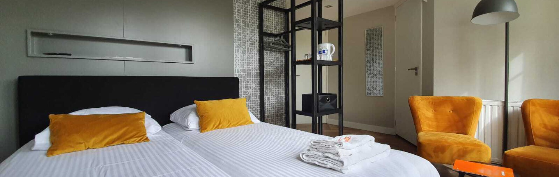 De kamer is ingericht in industriële sfeer en voorzien van TV, gratis Wifi, eigen badkamer met douche en toilet en haardroger.